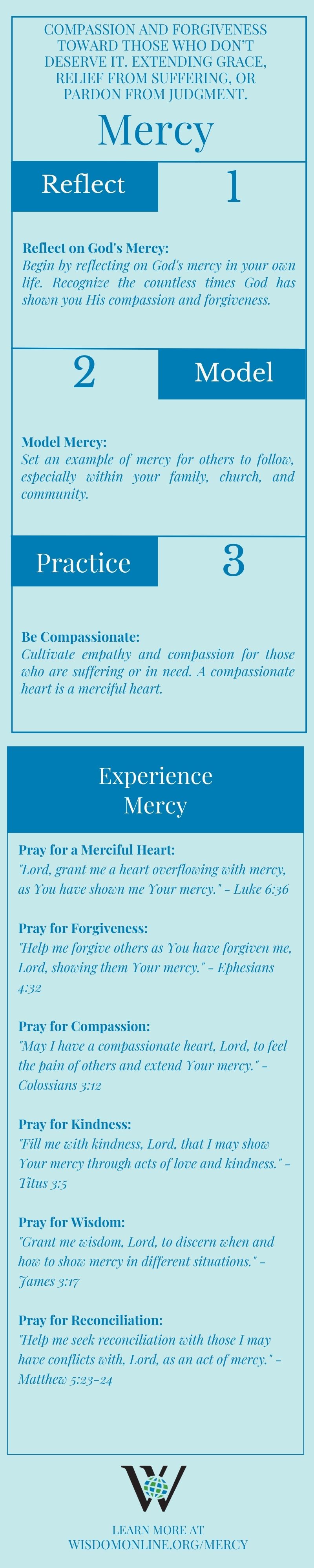 Mercy, within a biblical context, is an attribute of God Himself. It encompasses compassion and forgiveness toward those who may not deserve it. Mercy extends grace to others, offering relief from suffering or pardon from judgment. It reflects God's character and His desire for His children to be agents of His mercy in the world.