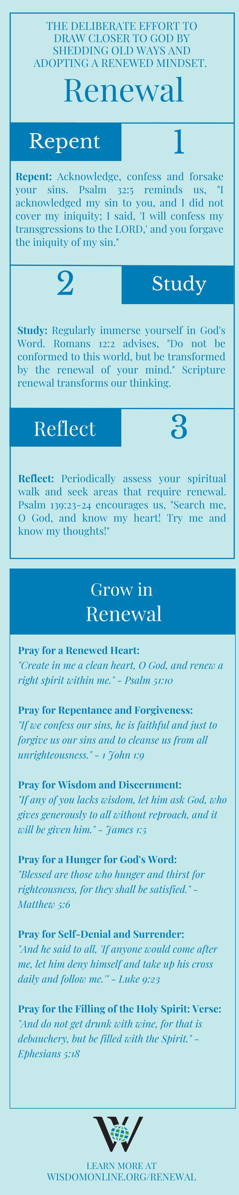 Prayer: Engage in heartfelt and sincere prayer, seeking God's presence and guidance in your journey of renewal. Pray for a renewed heart and spirit.